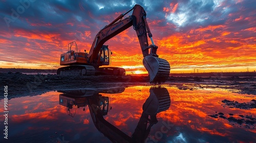 Excavator at sunset, reflecting in water, dramatic sky, Industrial scene, excavator silhouette, fiery sunset, 8k quality
