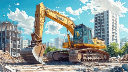 Excavator Demolishing Building Urban Site