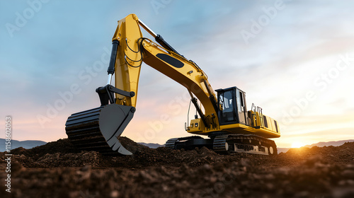Excavator digging earth at sunset.