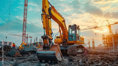 Excavator in action at a construction site during a vibrant sunset, showcasing heavy machinery and urban development.