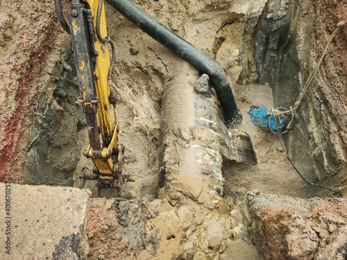 Excavators dig holes to destroy concrete roads to repair damaged water pipes.