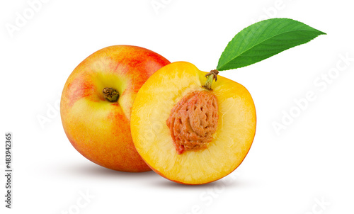Excellent ripe nectarine whole and half with green leaf isolated on white background