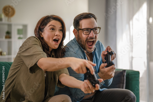 Excited couple playing video games together at home