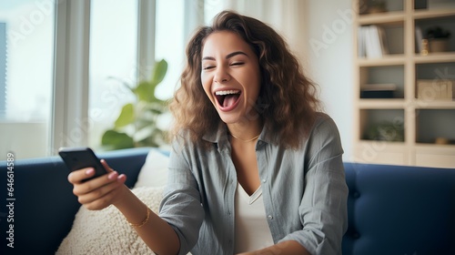 Excited happy young woman holding smart phone device sitting on sofa at home. Happy satisfied female looking at mobile smartphone screen, gesturing and shout yes. generative AI