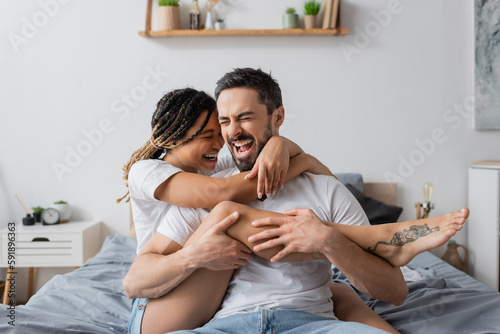 excited interracial couple in white t-shirts embracing while having fun in bedroom at home.