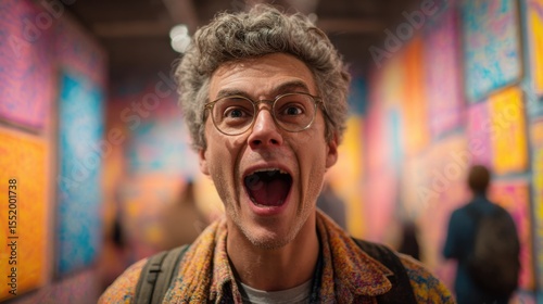 Excited visitor reacts to vibrant art in gallery during exhibition opening event in the evening