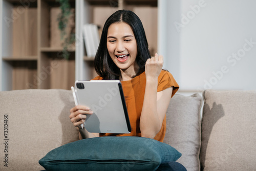 Excited woman work distant on computer talk on cellphone celebrate online win. Happy young female use laptop feel euphoric overjoyed triumph with good news over smartphone call.