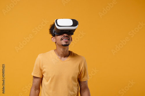 Excited young african american guy in casual t-shirt posing isolated on yellow orange background studio portrait. People sincere emotions lifestyle concept. Mock up copy space. Watching in headset.