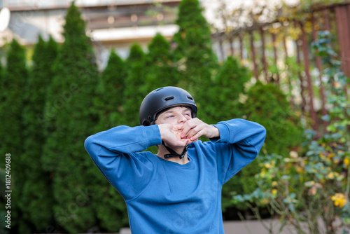 Excited young teenage boy in a safety helmet cheering or reacting enthusiastically with a joyful, exaggerated expression outdoors