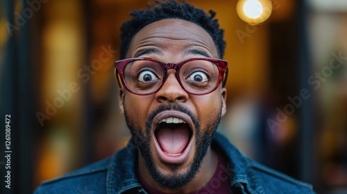 Excitement and joy radiate as a man expresses pure astonishment in a lively urban setting during twilight hours