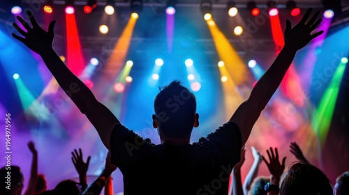 Exciting concert scene with diverse audience celebrating music under vibrant colorful stage lights