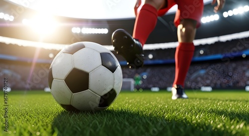 Exciting Soccer Match with Player Kicking Ball on Field During Sunset