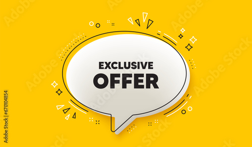 Exclusive offer tag. 3d speech bubble yellow banner. Sale price sign. Advertising discounts symbol. Exclusive offer chat speech bubble message. Talk box infographics. Vector