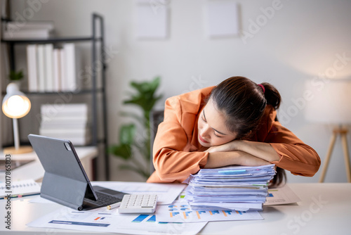 Exhausted asian accountant sleeping on desk after working with financial documents at office