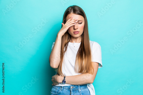 Exhausted woman touching head while standing with closed eyes on pastel blue background