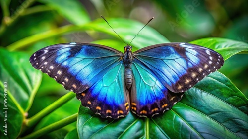 Exotic blue and black butterfly species resting peacefully on a lush green leaf, showcasing its striking colors and intricate patterns , insect perched, flower