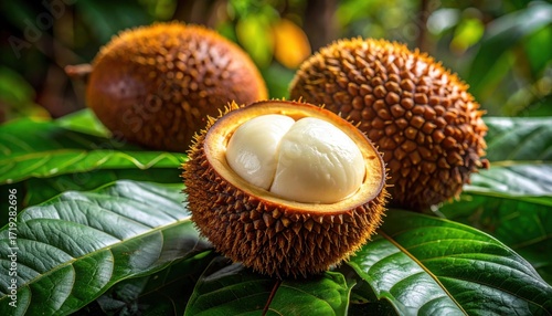 Exotic spiky fruit with creamy white interior placed on tropical leaves symbolizing wild harvest gourmet experience and adventurous culinary exploration