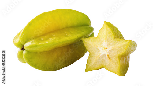 Exotic tropical carambola fruit, whole and sliced, with juicy yellow flesh visible