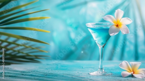 Exotic Tropical Cocktail with Plumeria Flower in Martini Glass on Turquoise Background.with copy space