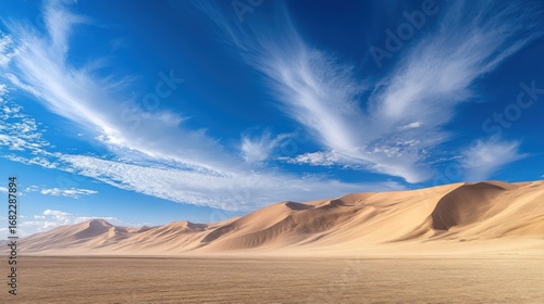 Expansive desert landscape with rolling sand dunes under a vibrant blue sky with wispy cloud formations above