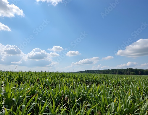 Expansive Green Corn Field Under Bright Blue Sky with Fluffy White Clouds on a Sunny Day