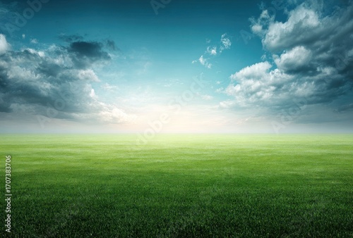 Expansive green meadow meets bright sky with scattered clouds, suggesting peace and openness in a calming, vibrant outdoor scene