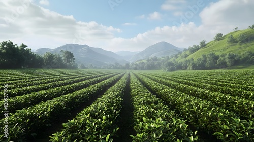 Expansive Lush Green Tea Plantation with Rows of Vibrant Green Bushes Under a Clear Blue Sky