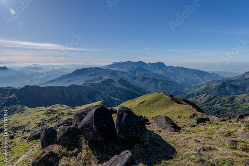 Expansive panoramic view of the mountain landscape softly veiled in gentle mist at Mount Mulayit, Myanmar.