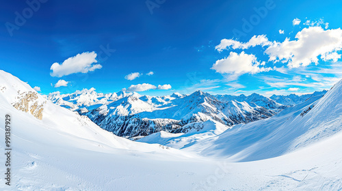 Expansive view of a snow-covered mountain landscape under a clear blue sky, featuring dramatic peaks and serene valleys