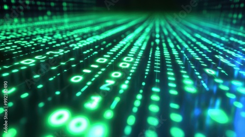 Experience a captivating view of binary code flowing in a green matrix style on a sleek, black background.
