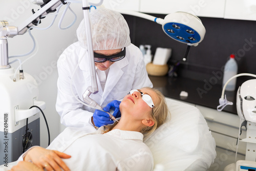 Experienced elderly female cosmetologist performing laser facial treatment to young woman in aesthetic medicine office