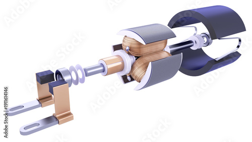 Exploded View Electric Motor Complete Disassembly. Inside Parts - Stator, Rotor and Windings, brushes, commutator, shaft. 3D rendering isolated on white background. Ideal for educational, engineering