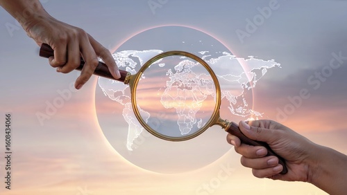 Explore global opportunities with a magnifying glass over a glowing world map at sunset for business growth