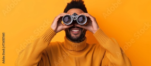 Exploring adventurer bearded man looking through binoculars in the wilderness