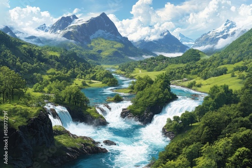 Exploring majestic waterfalls and lush green valleys in a serene mountain landscape