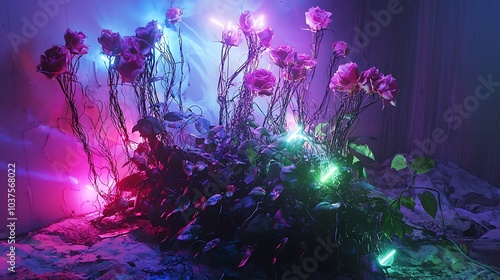Exploring the enigmatic lost city of vines and wires a journey through illuminated flora and futuristic landscapes