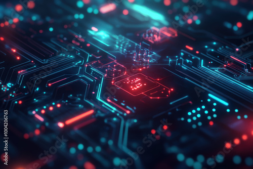 Exploring the intricacies of a futuristic circuit board illuminated by vibrant blue and red lights. Generative AI