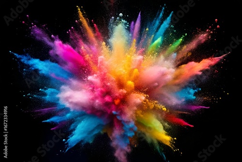 Explosion of vibrant, colorful powder paint against a stark black background, capturing a dynamic and energetic holi festival celebration or abstract art concept