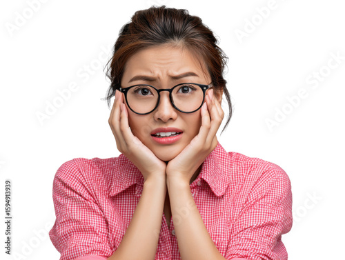 Expressions of Apprehension: Capturing the raw emotion of worry and fear, showcasing the nuances of human reaction, glasses and touch face.