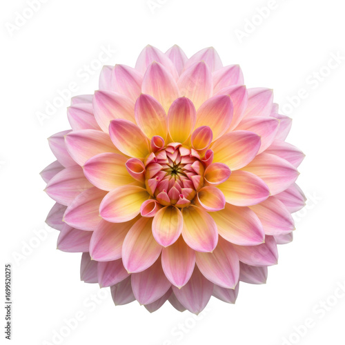 Exquisite dahlia bloom a detailed view of pink and yellow petals isolated on white background