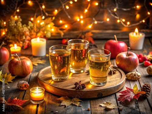 Exquisite Night Photography of an Apple Cider Tasting Flight with Vibrant Glasses and Captivating Fall Decor Under Soft Candlelight