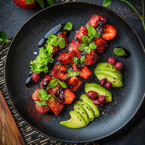 Exquisite plate of delicious food artistically presented on a dining table for a memorable meal