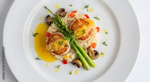 Exquisite Seared Scallops with Risotto, Asparagus, and Garnish on White Plate