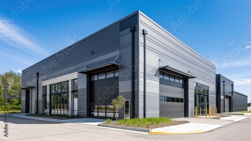 Exterior of a modern warehouse with a small office unit, Generative Ai