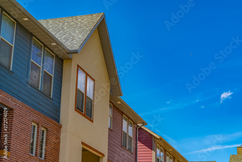 Exterior view of houses against blue sky with wispy clouds on a sunny day