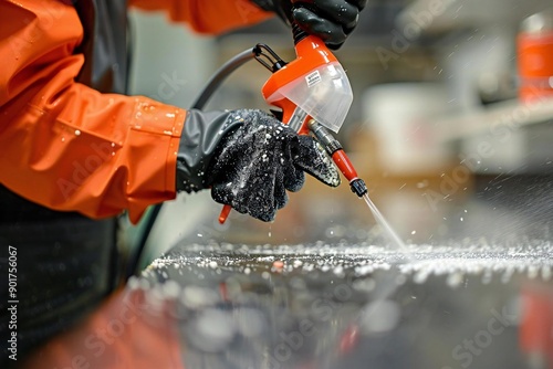 Exterminator Spraying Pesticide on Kitchen Counter In Midsection View