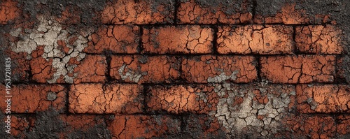 Extreme close up of weathered cracked red brick wall with peeling paint texture