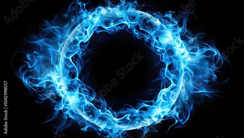 Extreme close-up abstract blue fire ring on black background with smoke and sparks