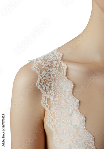 Extreme close-up of a delicate ivory lace strap with floral pattern on fair-skinned female shoulder against transparent studio background, concept of delicate elegance