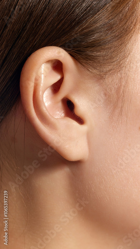 Extremely close-up of female ear without piercing, jewelry. Healthy, smooth skin. Concept of beauty, healthcare, freshness and wellness, confidence. Ad